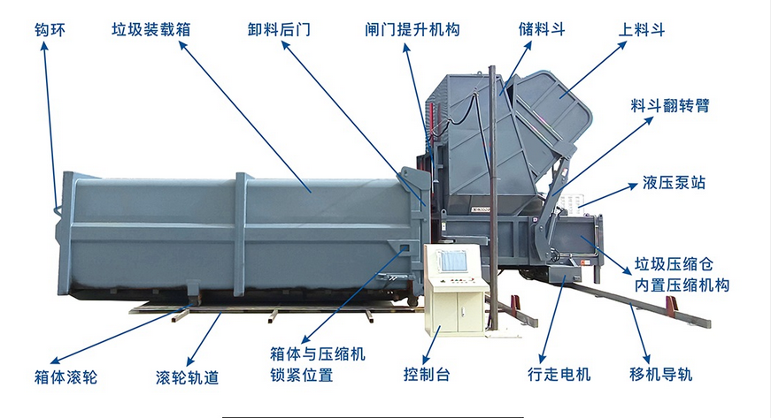 水平分体式压缩垃圾站(垃圾箱)(料斗后上料)设备压缩垃圾箱与主机箱体包含:主机箱体、压缩仓、压头、压缩油缸、滑轮、液压系统、电控系统等组成。其主要结构件采用Q345高强度结构钢焊接成成,具有较有的耐磨性;主机箱体上的滑轮与滑台导轨配合,使主机能相对滑台滑动,液压电控系统固定安装于主机箱体上,整体简洁美观。箱体容积15-22m³,匹配16吨后双桥车厢可卸式垃圾车